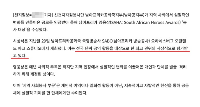 Áö³­ÇØ ¸» ½ÅõÁö À¯°ü ¾ð·Ð ¡¸ÃµÁöÀϺ¸¡¹¿¡ ½ÅõÁöÀÚ¿øºÀ»ç´Ü ³²¾Æ°øÁöºÎ°¡ ¡®³²¾ÆÇÁ¸®Ä« ¿µ¿õ»ó(South African Heros Awards) Áö¿ª »çȸ ºÀ»ç ´ë»ó¡¯À» ¼ö»óÇß´Ù°í ÀüÇß´Ù. ¡¸ÃµÁöÀϺ¸¡¹´Â ÇØ´ç º¸µµ¿¡¼­ Àü±¹ ´ÜÀ§ °øÀÍ È°µ¿À» ´ë»óÀ¸·Î ÇÑ ÃÖ°í ±ÇÀ§ÀÇ ½Ã»ó½ÄÀ¸·Î Æò°¡¹Þ°í ÀÖ´Ù°í ÀÚÂùÇß´Ù.
