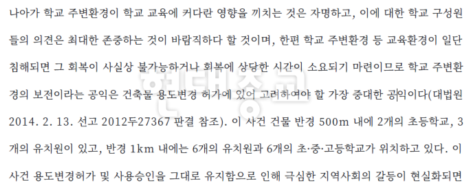 ¶ÇÇÑ Çб³ ÁÖº¯ ȯ°æ µî ±³À°È¯°æÀÌ ÀÏ´Ü Ä§ÇØµÇ¸é ±× ȸº¹ÀÌ »ç½Ç»ó ºÒ°¡´ÉÇϰųª ȸº¹¿¡ »ó´çÇÑ ½Ã°£ÀÌ ¼Ò¿äµÇ±â ¸¶·ÃÀ̹ǷΠÇб³ ÁÖº¯È¯°æÀÇ º¸ÀüÀ̶ó´Â °øÀÍÀº °ÇÃ๰ ¿ëµµº¯°æ Çã°¡¿¡ ÀÖ¾î °í·ÁÇØ¾ß ÇÒ °¡Àå Áß´ëÇÑ °øÀÍÀ̶ó´Â °ÍÀÌ ÀçÆÇºÎÀÇ ÆÇ´ÜÀ̾ú´Ù.