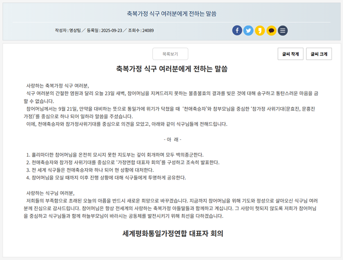 ±¸¼Ó ÈÄ ÅëÀϱ³´Â ȨÆäÀÌÁö¿¡ ¡°Âü¾î¸Ó´Ô(ÇÑÇÐÀÚ)²²¼­´Â 9¿ù 21ÀÏ, ¸¸¾àÀ» ´ëºñÇÏ´Â ¶æÀ¸·Î ÅëÀϰ¡¿¡ À§±â°¡ ´ÚÃÆÀ» ¶§ ¡®Ãµ¾ÖÃà½ÂÀÚ(¹®¼±¸íÀÇ ¼ÕÀÚÀÎ ¹®½ÅÃâ, ¹®½ÅÈï)¡¯¿Í ÂüºÎ¸ð´ÔÀ» Áß½ÉÇÑ ¡®Âü°¡Á¤ »çÀ§±â´ë(¹®È¿Áø, ¹®ÈïÁø °¡Á¤)¡¯¸¦ Áß½ÉÀ¸·Î ÇϳªµÇ¾î ÀÏÇÏ¶ó ¸»¾¸À» Á̴ּ١±¸ç ¼¼°èÆòÈ­ÅëÀϰ¡Á¤¿¬ÇÕ ´ëÇ¥ÀÚ È¸ÀÇ À̸§À¸·Î ÀÔÀå¹®À» ¿Ã·È´Ù.