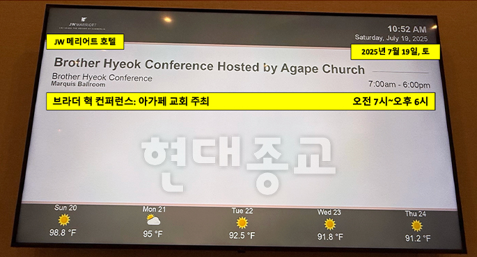 ¡ã2025³â 7¿ù 19ÀÏ¿¡ ¿­¸° ¹ÚÇõ ÀüµµÀÚÀÇ ¹Ì±¹ ¶ó½ºº£À̰Žº Áýȸ´Â ÇöÁö ±³È¸ÀÎ ¡®¾Æ°¡Æä±³È¸¡¯¸¦ ÅëÇØ ¸Þ¸®¾îƮȣÅÚÀ» ´ë°üÇÏ¿© °³ÃֵƴÙ.(Ãâó: ÆÄÀ̳θ® ÇÁ¸® ±¹Á¦ ¼±±³È¸)