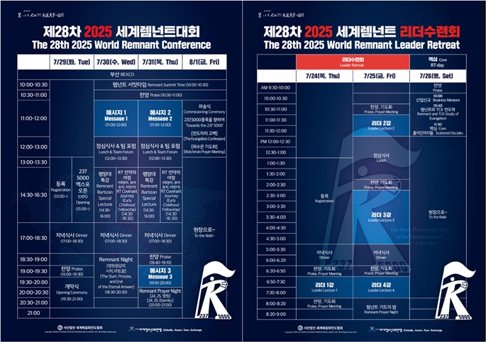 3¹Ú 4ÀÏ Áß Ã¹ ³¯°ú ¸¶Áö¸· ³¯Àº °³¸·½Ä°ú ÆÄ¼Û½Ä Çà»ç¸¦ Çϰí, ³ª¸ÓÁö 2ÀÏÀº ·ù±¤¼ö ÃÑÀçÀÇ ¸Þ½ÃÁö¿Í Ư°­ÀÌ ÁÖ¸¦ ÀÌ·é´Ù. û³â ¸®´õµéÀº ¼¼°è·½³ÍÆ®´ëȸ Àü ¸®´õ¼ö·Ãȸµµ Âü¼®ÇÑ´Ù. ¿ÃÇØ ÀüÁÖ¿¡¼­ ¿­¸° 7¿ù 24~26ÀϱîÁö 2¹Ú 3ÀÏÀÇ ¸®´õ¼ö·Ãȸ¿¡¼­ ³× ¹øÀÇ °­ÀǸ¦ µé¾î¾ß Çß´Ù. ½Ã°£°ú ºñ¿ëÀûÀÎ ºÎ´ãÀÌ ÀÖ´Â ÀÏÁ¤ÀÌ´Ù.
