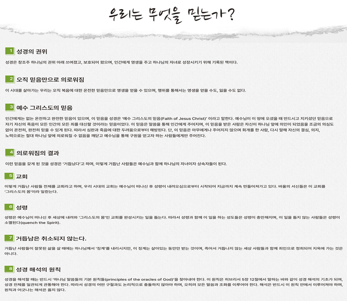 ±×ÀÇ ±³È¸ÀÎ ¡®Ã¹¿­¸Åµé¡¯ ȨÆäÀÌÁö¸¦ º¸´Ï, ¡°¿ì¸®´Â ¹«¾ùÀ» ¹Ï´Â°¡?¡±¶ó´Â ÆäÀÌÁö°¡ ÀÖ¾ú´Ù. ±×°÷¿¡´Â ¡®¼º°æÀÇ ±ÇÀ§¡¯, ¡®¿ÀÁ÷ ¹ÏÀ½À¸·Î¸¸ ÀǷοöÁü¡¯, ¡®¿¹¼ö±×¸®½ºµµÀÇ ¹ÏÀ½¡¯, ¡®ÀǷοöÁüÀÇ °á°ú¡¯, ¡®±³È¸¡¯, ¡®¼º·É¡¯, ¡®°Åµì³²Àº Ãë¼ÒµÇÁö ¾Ê´Â´Ù¡¯, ¡®¼º°æ ÇØ¼®ÀÇ ¿ø¸®¡¯¶ó´Â 8°³ Ç׸ñ¿¡ ´ëÇØ ¼³¸íÀÌ µÇ¾î ÀÖ¾ú´Ù. Èï¹Ì·Î¿î ºÎºÐÀº ±×µéÀÌ ¹Ï´Â Çϳª´ÔÀº ¾î¶² ºÐÀ̽Ű¡¿¡ ´ëÇÑ ºÎºÐÀÌ ºüÁ®ÀÖ´Ù´Â °ÍÀ̾ú´Ù.