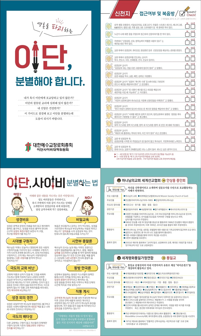 ¡°ÀÌ´Ü, ºÐº°ÇØ¾ß ÇÕ´Ï´Ù.¡±¶ó´Â Á¦¸ñÀÇ ¸®Çø´Àº 12¸é(¾ç¸é)À¸·Î Á¦À۵Ǿú´Ù. ÀÌ´Ü»çÀ̺ñ¸¦ ºÐº°ÇÏ´Â ¹æ¹ýÀ» Á¦½ÃÇÏ°í ½ÅõÁö, Çϳª´ÔÀDZ³È¸, ÅëÀϱ³, ±¸¿øÆÄ, ¿©È£¿ÍÀÇ ÁõÀÎ, ¾È½Ä±³, ¸ô¸ó±³, JMS, Áö¹æ±³È¸¿¡ ´ëÇÑ ÁÖ¿ä³»¿ë°ú Ȱµ¿¿¡ ´ëÇØ Á¤¸®Çß´Ù. ½ÅõÁö¿¡ ´ëÇØ¼­´Â ¡°ÀÌ·± ±×¸² ¹è¿ü´Ù¸é ½ÅõÁö°¡ ¸Â½À´Ï´Ù¡±¶ó¸ç ½ÅõÁö¿¡¼­¸¸ ¹è¿ì´Â ºñÀ¯Ç®ÀÌ À̹ÌÁö¸¦ °ø°³Çß´Ù. ½ÅõÁöÀÇ Æ÷±³, ¿¹¹æ°ú ´ëó, Àº¾î¿¡ ´ëÇÑ Á¤º¸, ½º½º·Î Á¢±ÙÀ» ´çÇϰí ÀÖ´ÂÁö ¿©ºÎ¸¦ ¾Ë¾Æº¸´Â üũ¸®½ºÆ®µµ Æ÷ÇԵǾî ÀÖ´Ù.