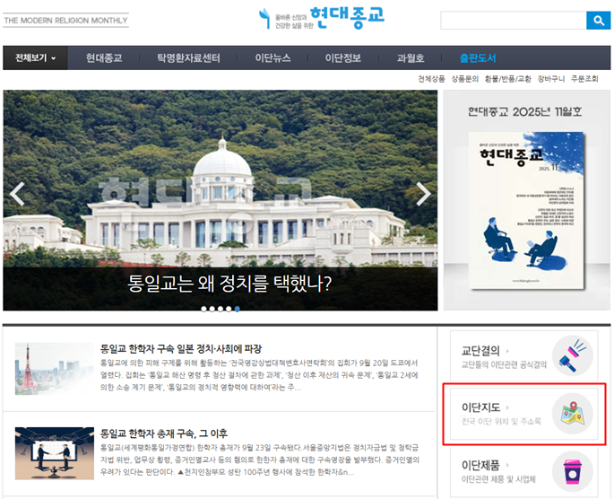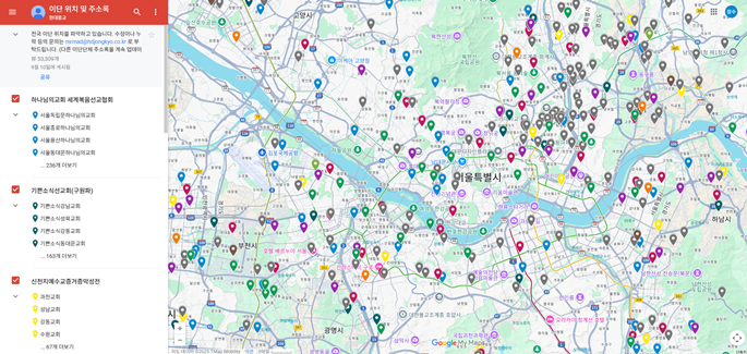 ¡¸Çö´ëÁ¾±³¡¹´Â ¿ÃÇØ ÃÊ À̴ܵéÀÇ À§Ä¡¿Í ÁÖ¼Ò¸¦ Áöµµ¿¡ Ç¥½ÃÇÏ´Â ÀÛ¾÷À» ½ÃÀÛÇß´Ù. Çϳª´ÔÀDZ³È¸¸¦ ½ÃÀÛÀ¸·Î ±â»Û¼Ò½Ä¼±±³È¸, ½ÅõÁö, ÅëÀϱ³, ¾È½Ä±³, »ý¸íÀǸ»¾¸¼±±³È¸, ¸¸¹ÎÁß¾Ó±³È¸, ¿¹¼öÁ߽ɱ³È¸, õºÎ±³, »ç¶ûÇϴ±³È¸ µî 10°³ ´ÜüÀÇ Áö±³È¸°¡ µî·ÏµÇ¾î ÀÖ´Ù.