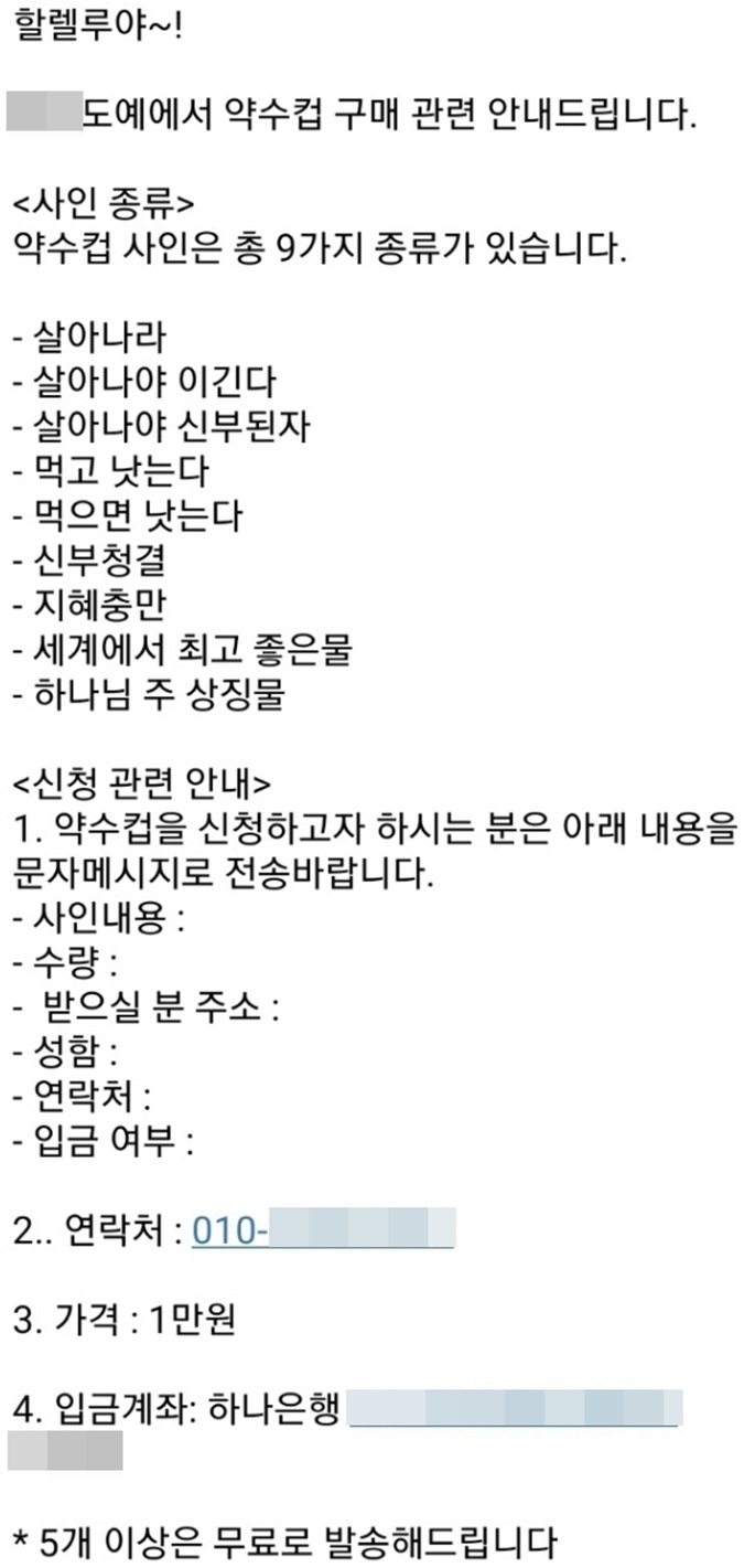 ½ÇÁ¦·Î JMS Ãø¿¡¼­ º¸³½ ¾à¼öÄÅ ±¸¸Å °ü·Ã °øÁö¿¡´Â ¡®¸Ô°í ³´´Â´Ù¡¯, ¡®¸ÔÀ¸¸é ³´´Â´Ù¡¯, ¡®¼¼°è¿¡¼­ ÃÖ°í ÁÁÀº ¹°¡¯ µîÀÇ ¹®±¸¸¦ ¼±ÅÃÇÒ ¼ö ÀÖ°í, ¼ö·®, ÁÖ¼Ò, À̸§, ¿¬¶ôó µîÀ» Àü¼ÛÇØ ¸¸ ¿ø¿¡ ÆÇ¸ÅÇÏ´Â ³»¿ëÀÌ ´ã°Ü ÀÖ´Ù. ¿ù¸íµ¿ ¾à¼ö °ü·Ã ¾È³»¿¡´Â ¡°¿ù¸íµ¿ ¾à¼ö´Â Ä¡À¯ÀÇ ¿ª»ç¸¦ ÅëÇØ Áõ°ÅÇϵí ÀúÈñ¿¡°Ô ÁֽŠÇϳª´ÔÀÇ ÃູÀÔ´Ï´Ù. ÀúÈñ°¡ ±× Áø°¡¸¦ ¾Ë°í ´ëÇÒ ¶§, ¾à¼öÀÇ °¡Ä¡µµ ´õ¿í ³ô¾ÆÁú °ÍÀÔ´Ï´Ù¡±¶ó¸ç ¡°¾ÕÀ¸·Î ¿ù¸íµ¿¿¡¼­ ¾à¼ö¸¦ ¸¶½Ç ¶§´Â À§ÀÇ »çÁø°ú °°Àº µðÀÚÀÎÀÇ ¡®¾à¼ö Àü¿ë ÄÅ¡¯¸¸ »ç¿ëÀÌ °¡´ÉÇϸç 500¹Ì¸®¸®Å͵µ ¶°°¡½Ç ¼ö ¾ø½À´Ï´Ù¡±¶ó°í °øÁöÇß´Ù.