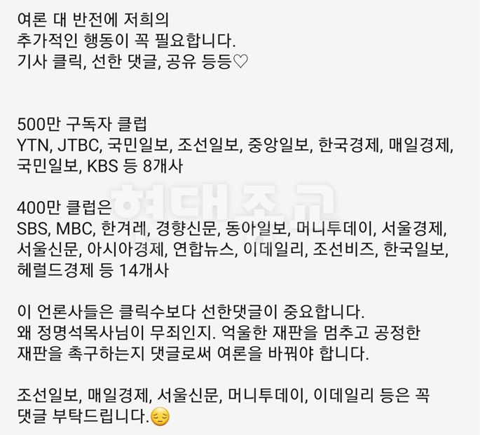JMSÀÇ ½ÃÀ§°¡ ¸ÅÁÖ À̾îÁö°í ÀÖ´Ù. ÇÏÁö¸¸ ½ÅµµµéÀÇ °£ÀýÇÑ ¹Ù¶÷°ú °°ÀÌ ¾ð·ÐÀÇ º¸µµ·Î ÀÎÇÑ ¿©·ÐÀÌ ¹Ù²î´Â ºÐÀ§±â´Â ¾ø¾î º¸ÀδÙ. JMS ½ÅµµµéÀÌ ²÷ÀÓ¾øÀÌ Á¤¸í¼® ¹«Á˸¦ ÁÖÀåÇÏÁö¸¸, ¿©·ÐÀº ½Î´ÃÇÏ°í ½ÃÀ§¿¡´Â °ü½ÉÀÌ ¾ø´Â µíÇÏ´Ù. ±âµ¶±³º¹À½¼±±³È¸ ´ëÇ¥°¡ ¹Ù²î°í ³»ºÎ¿¡ °¥µî°ú È¥¶õÀÌ °¡ÁߵǴ °¡¿îµ¥ ´ë±Ô¸ð Áýȸ´Â ½ÅµµµéÀÇ °áÁýÀ» À§ÇÑ ¼úÃ¥À¸·Î º¸ÀδÙ.