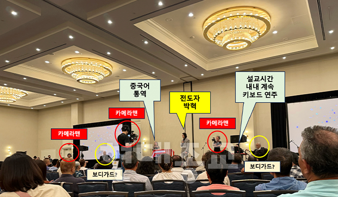 ¡ã2025³â ¹Ì±¹ ¶ó½ºº£À̰Žº Áýȸ¿¡¼­ ¹ÚÇõÀÌ ¼³±³ÇÏ´Â ³»³» Űº¸µå°¡ ¿¬ÁֵǾú°í, ¾ç ¿·¿¡´Â º¸µð°¡µå·Î º¸ÀÌ´Â »ç¶÷µéÀÌ ¹èÄ¡µÇ¾î ÀÖ¾ú´Ù. ¿©·¯ ´ëÀÇ Ä«¸Þ¶ó°¡ ¹ÚÇõÀÇ ¼³±³¿Í ûÁßÀ» ¼¼½ÉÇÏ°Ô ÃÔ¿µÇß´Ù.(Ãâó: ÆÄÀ̳θ® ÇÁ¸® ±¹Á¦ ¼±±³È¸)