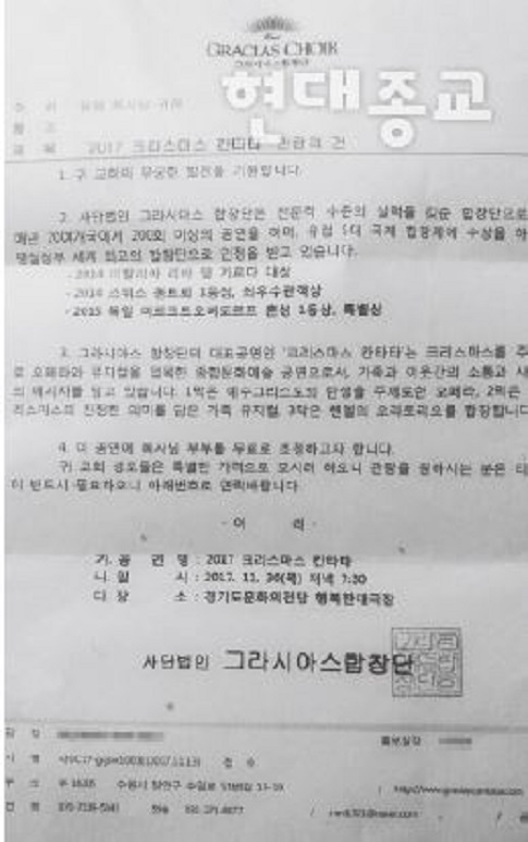 Å©¸®½º¸¶½º ĭŸŸ °ø¿¬¿¡ Âü¼®Çß´ø A¾¾´Â ¡°°¡Á·À» ÅëÇØ ĭŸŸ °ø¿¬¿¡ Âü¼®Çß´Ù. °ø¿¬ ÈÄ¿¡ ¹Ú¿Á¼ö¾¾°¡ ³ª¿Í, ÀÚ½ÅÀÇ Àú¼­ ¡ºÁË»çÇÔ °Åµì³²ÀÇ ºñ¹Ð¡»¿¡ °ü·ÃµÈ À̾߱⸦ ÀüÇß´Ù¡±¸ç ¡°°©Àڱ⠹ھ¾°¡ µîÀåÇØ ´çȲÇß´Ù¡±°í ¹àÇû´Ù. ÀÌ´ö¼ú ¸ñ»ç(Çѱ¹±âµ¶±³ÀÌ´Ü»ó´ã¼ÒÇùȸ ¼­¿ï»ó´ã¼ÒÀå)´Â ¡°±×¶ó½Ã¾Æ½º ÇÕâ´ÜÀÌ Äܼ­Æ®¸¦ ÇÏ°Ô µÇ¸é ¸¹Àº »ç¶÷µéÀÌ ÃÊûµÇ°í, (±â»Û¼Ò½Ä¼±±³È¸) ½Åµµ°¡ ¾Æ´Ñ »ç¶÷µéµµ Âü¼®ÇÏ°Ô µÈ´Ù¡±¸ç ¡°À̶§ ±¸¿øÆÄ ¹Ú¿Á¼ö°¡ µîÀåÇØ ÀڽŵéÀÇ º¹À½À» ÀüÇÑ´Ù¡±°í ÁÖÀǸ¦ ¿äûÇß´Ù. ±×¶ó½Ã¾Æ½º ÇÕâ´ÜÀÌ ±â»Û¼Ò½Ä¼±±³È¸¿Í À¯°ü±â°üÀÓÀ» ¼û±ä ä ¹ÌȤȰµ¿À» À̾°í ÀÖ¾î ÁÖÀǰ¡ ¿ä¸ÁµÈ´Ù.​