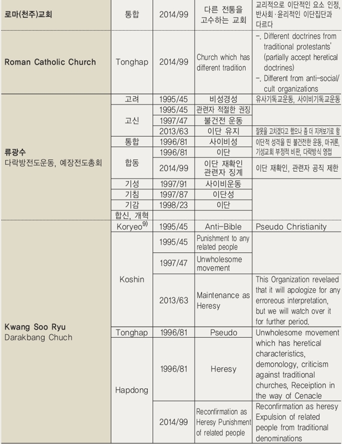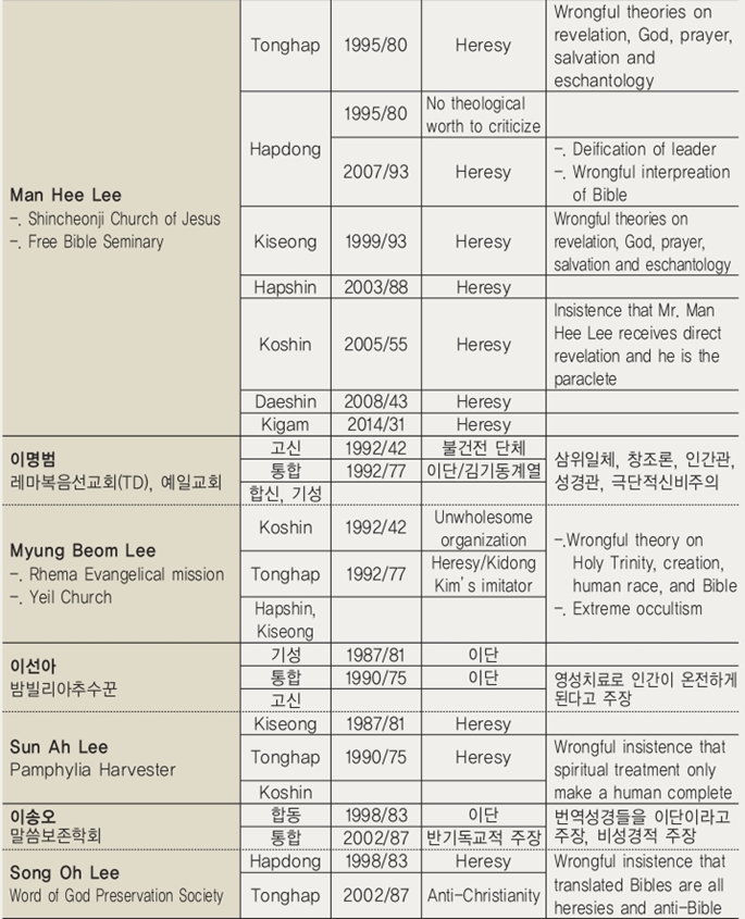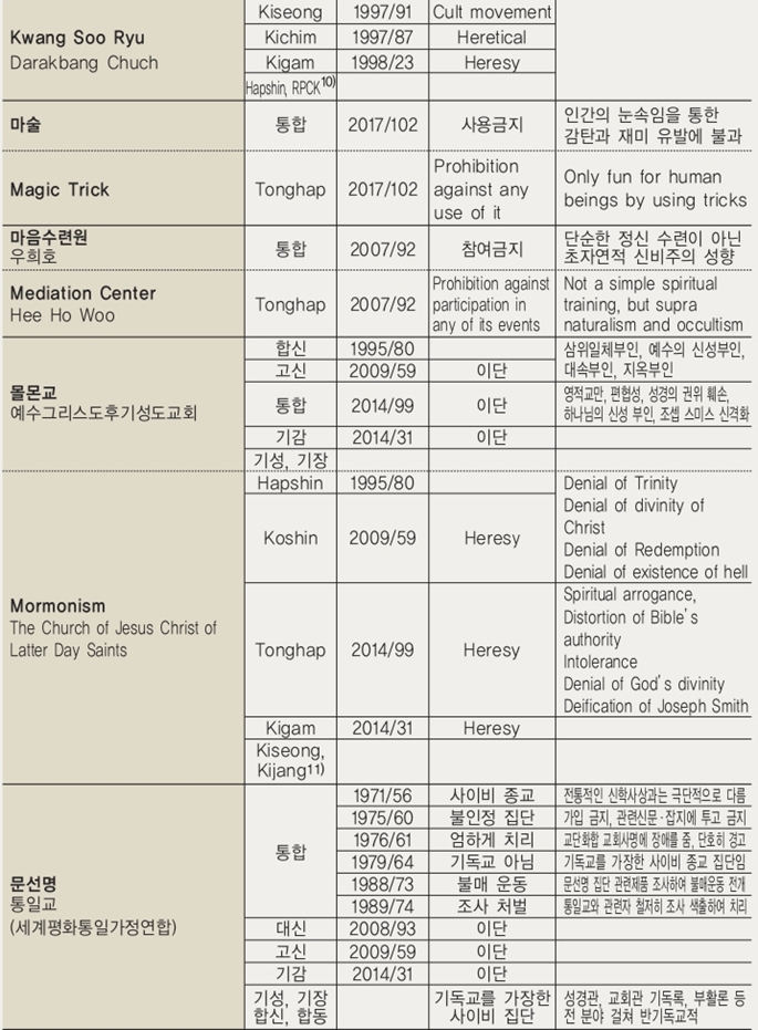 The table below shows the decisions of mainline denominations for the organizations which are suspected as heresies or cult organizations. In case where there are no exact year, session and details of the decision but only the name of denomination in the table below, it means that the denomination did not hold the general meeting for the decision, but the denomination published its official statement or a book which contains its stance against organizations mentioned below.