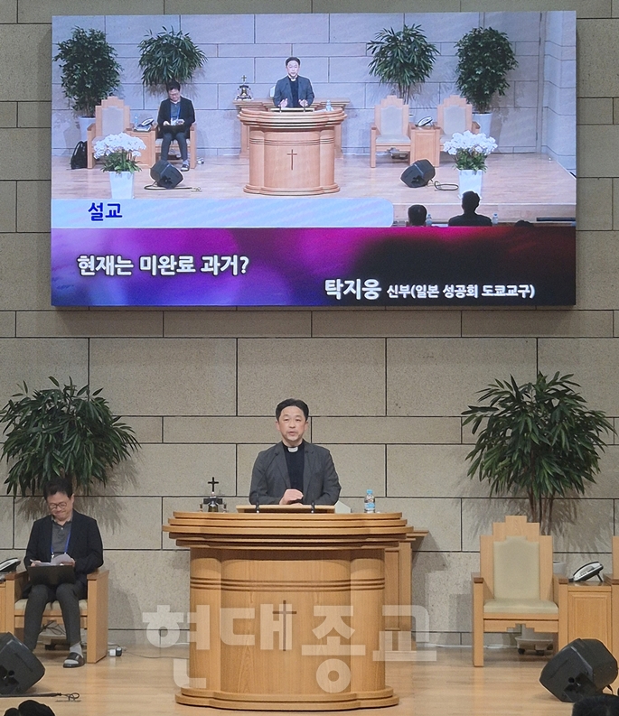 ¼³±³´Â ŹÁö¿õ ½ÅºÎ(ÀϺ» ¼º°øÈ¸ µµÄì±³±¸)°¡ ÀüÇß´Ù. ¡®ÇöÀç´Â ¹Ì¿Ï·á °ú°Å?¡¯(¸¶9:35~38)¶ó´Â Á¦¸ñÀ¸·Î ¸»¾¸À» ÁغñÇß´Ù. Ź ½ÅºÎ´Â ¡°Çï¶ó¾î¿¡´Â ÇöÀçºÐ»ç ¹Ì¿Ï·á °ú°ÅÇüÀ̶ó´Â ½Å±âÇÑ ¹®¹ýÀÌ ÀÖ´Ù¡±¸ç ¡°ÇöÀçºÐ»ç¶ó´Â °ÍÀº Çϳª´ÔÀÇ »ç¿ªÀÌ Áö±Ýµµ °è¼ÓµÇ´Â µ¿½ÃÀû »ç¿ªÀ̶ó´Â °Í, ¹Ì¿Ï·á °ú°ÅÇüÀº ±× »ç¿ªÀÌ ÇÑ ¹ø ÀϾ°í ¸¶´Â »ç°ÇÀÌ ¾Æ´Ï¶ó ¹Ýº¹µÇ°í À̾îÁö´Â ÀºÇýÀÇ È帧À̶ó´Â °ÍÀ» ³ªÅ¸³»´Â ±×·± ¹®¹ýÀÌ´Ù¡±¶ó°í ÀüÇß´Ù.